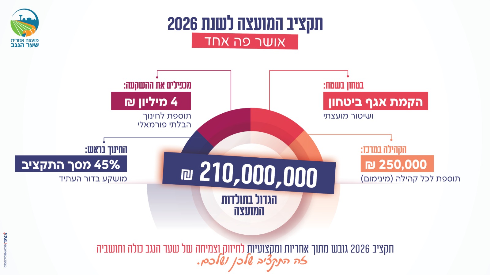 בסוף השבוע שעבר, סימנו רגע משמעותי בדרך משבר לצמיחה: מליאת המועצה אישרה פה אחד את תקציב שער הנגב לשנת 2026 - התקציב הגדול ביותר בתולדות המועצה, בהיקף של 210,826,000 מיליון ש״ח (אשתקד: 195,864,000). בתוך מציאות מורכבת, זו החלטה שמייצרת ודאות ומאפשרת לנו להמשיך לבנות תשתית יציבה לשירות, לביטחון ולצמיחה בכל היישובים.