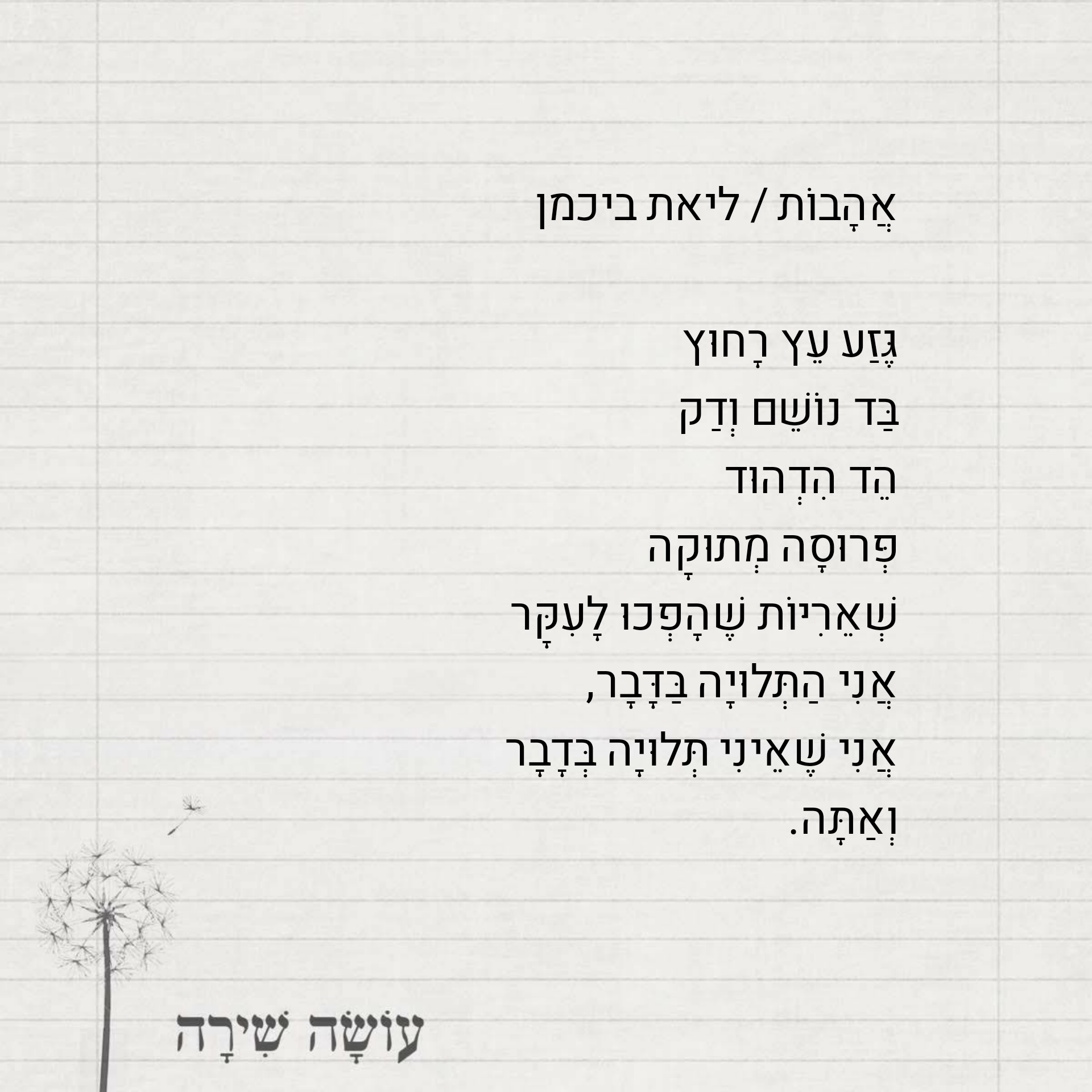 גֶּזַע עֵץ רָחוּץ בַּד נוֹשֵׁם וְדַק הֵד הִדְהוּד פְּרוּסָה מְתוּקָה שְׁאֵרִיּוֹת שֶׁהָפְכוּ לָעִקָּר אֲנִי הַתְּלוּיָה בַּדָּבָר, אֲנִי שֶׁאֵינִי תְּלוּיָה בְּדָבָר וְאַתָּה.