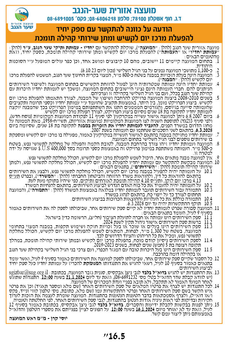 הודעה על כוונה להתקשר עם ספק יחיד להפעלת מרכז יום לקשיש ומתן שירותי קהילה תומכת