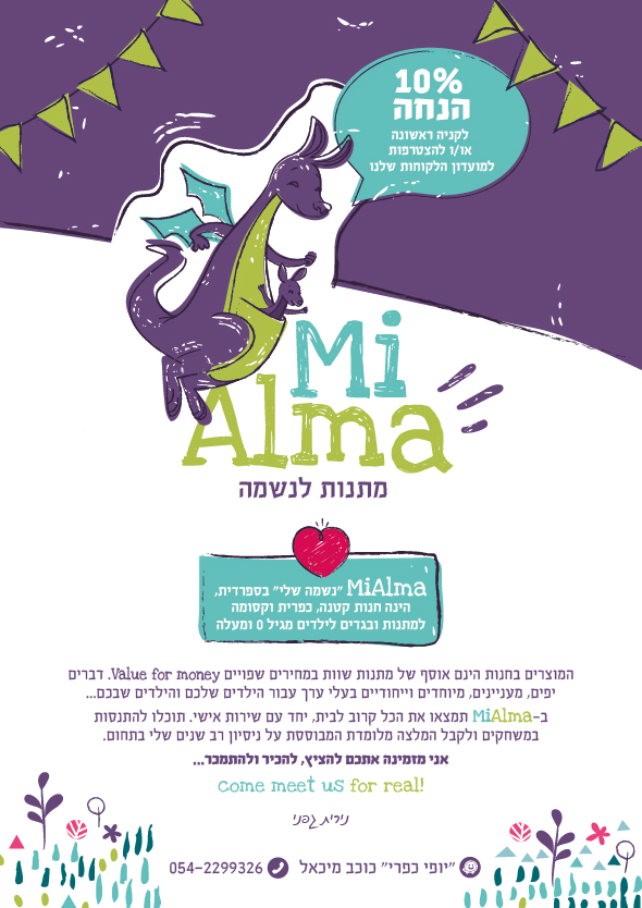 Mi Alma "נשמה שלי" בספרדית, הינה חנות קטנה, כפרית וקסומה למתנות ובגדים לילדים מגיל 0.
