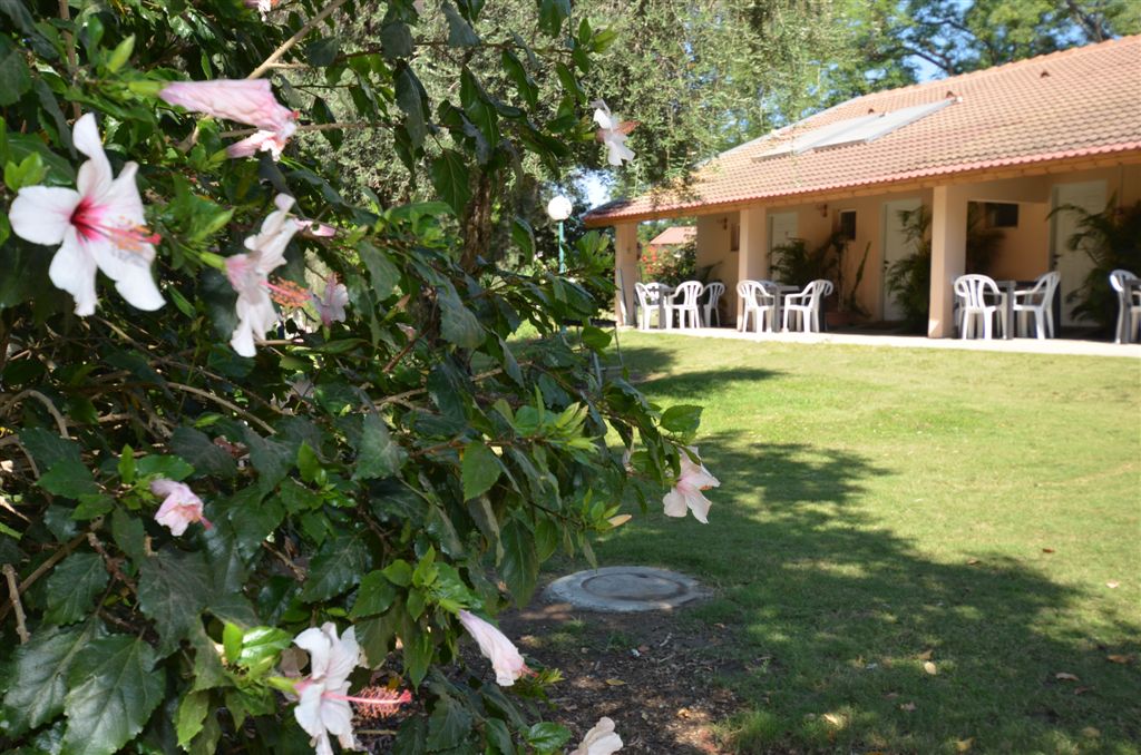 המתחם מוקף מדשאות, עצי זית וחורש ועליהן פינות ישיבה, פינות מנגל..