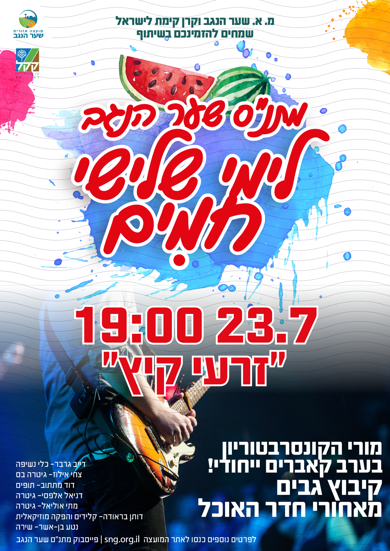 הוסף ללוח שנה 2026-04-06 21:24:08 1970-01-01 03:00:00 Asia/Jerusalem שלישי חמים במתנ"ס- זרעי קיץ למידע מלא: https://www.sng.org.il:443/events/171/ קיבוץ גבים מאחורי חדר האוכל
