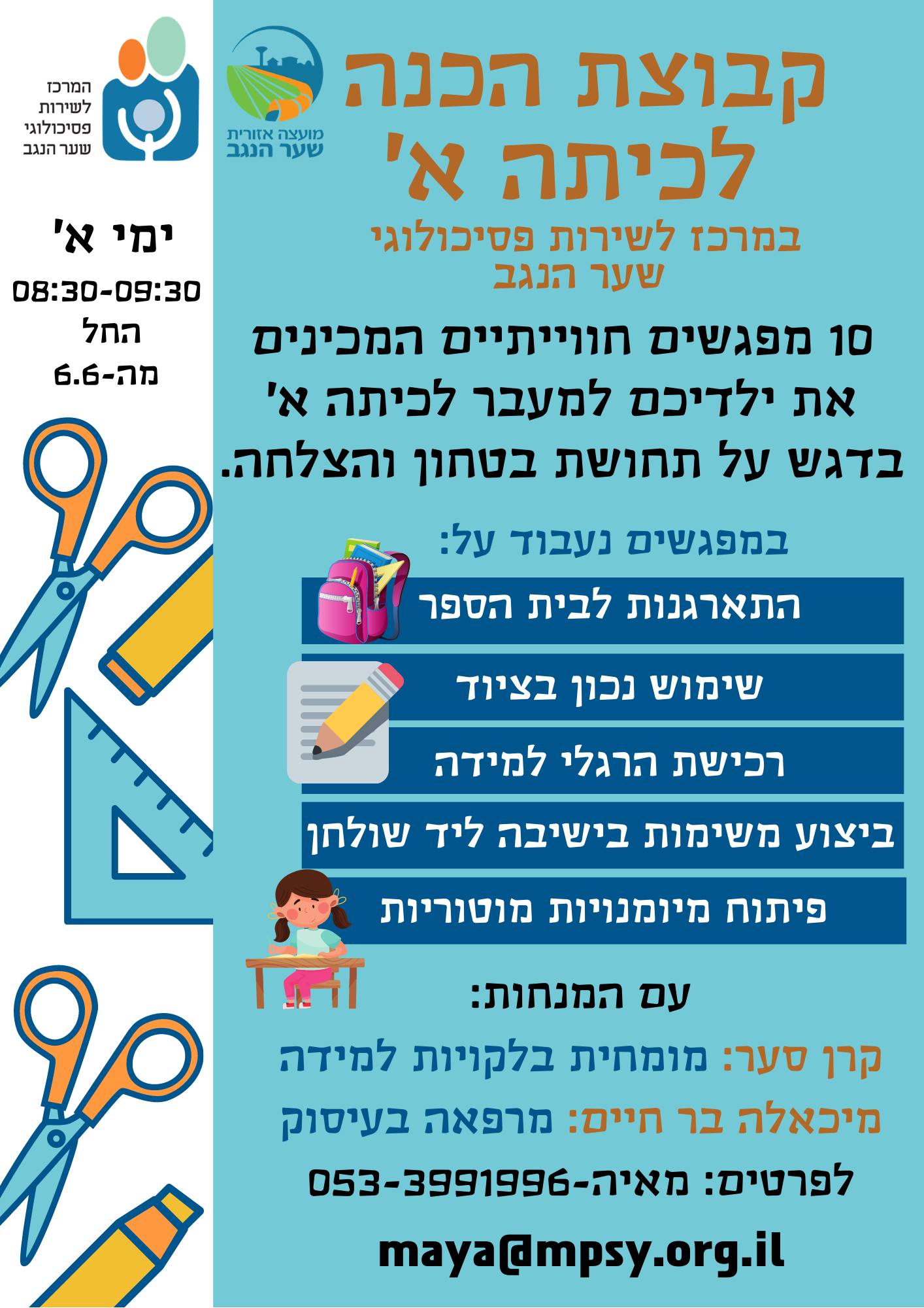 קבוצה בת 10 מפגשים שתכין את ילדיכם לחוויות המעבר מהגן לכיתה א', בדגש על תחושת בטחון והצלחה.