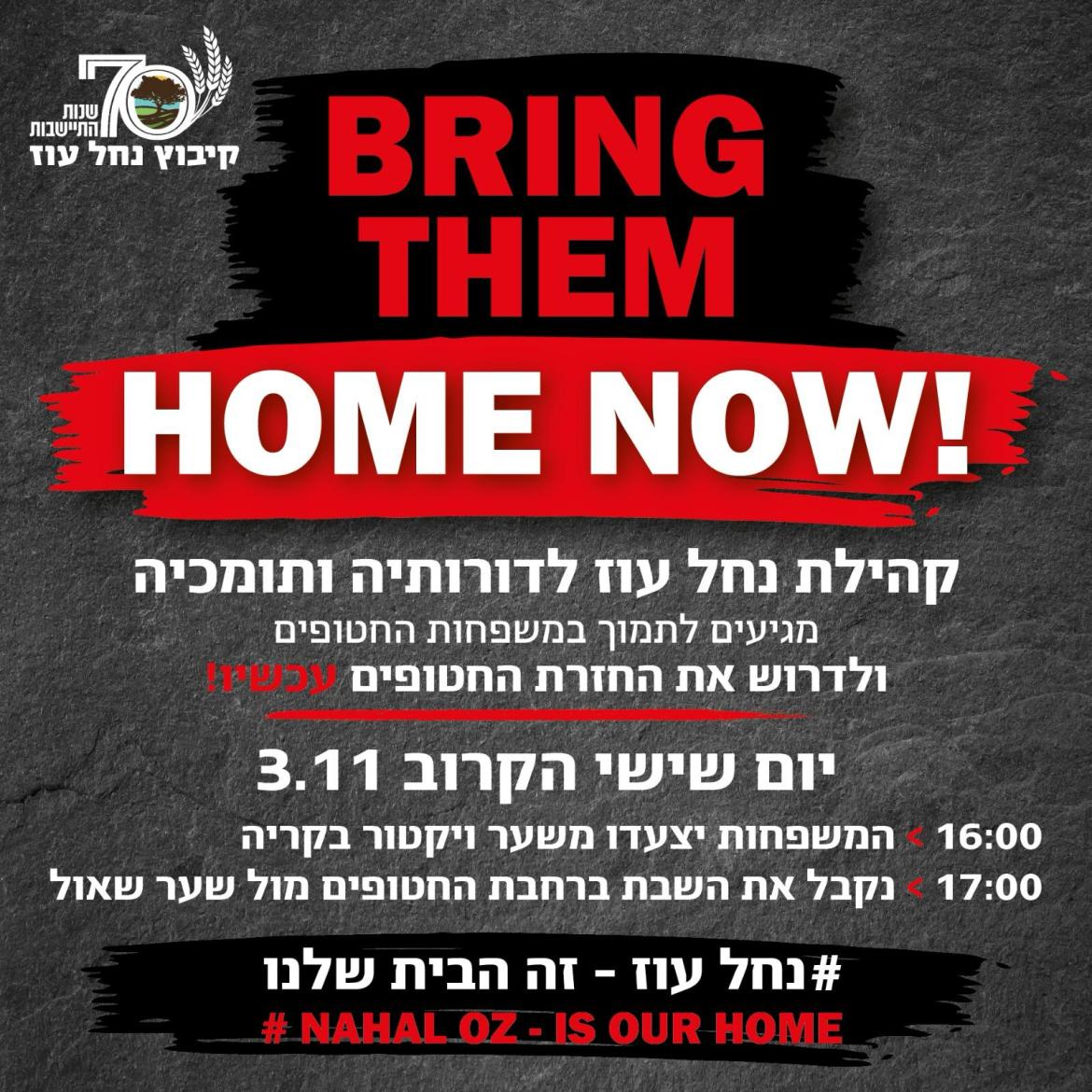 ביום שישי ה-3.11 בשעה 16:00 יקיימו משפחות החטופים של קיבוץ נחל עוז, יחד עם חברי הקהילה ותומכיה, צעידה וקבלת שבת בקריאה להשיב את חטופי נחל עוז וכלל החטופים לביתם.